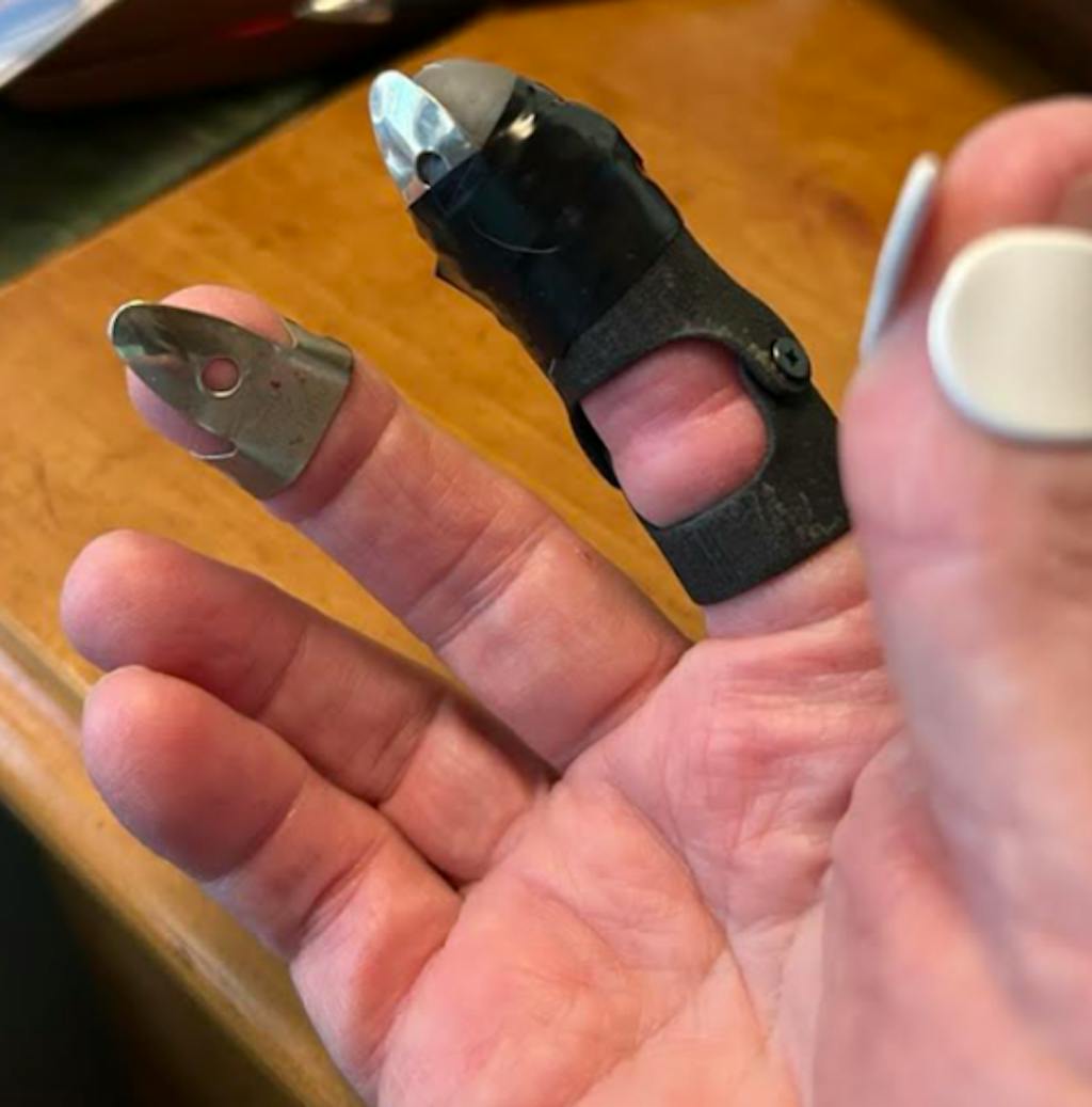 I attached a finger pick to the end of the Fingy using black electrical tape and am now able to finger pick my guitar and banjo!!
